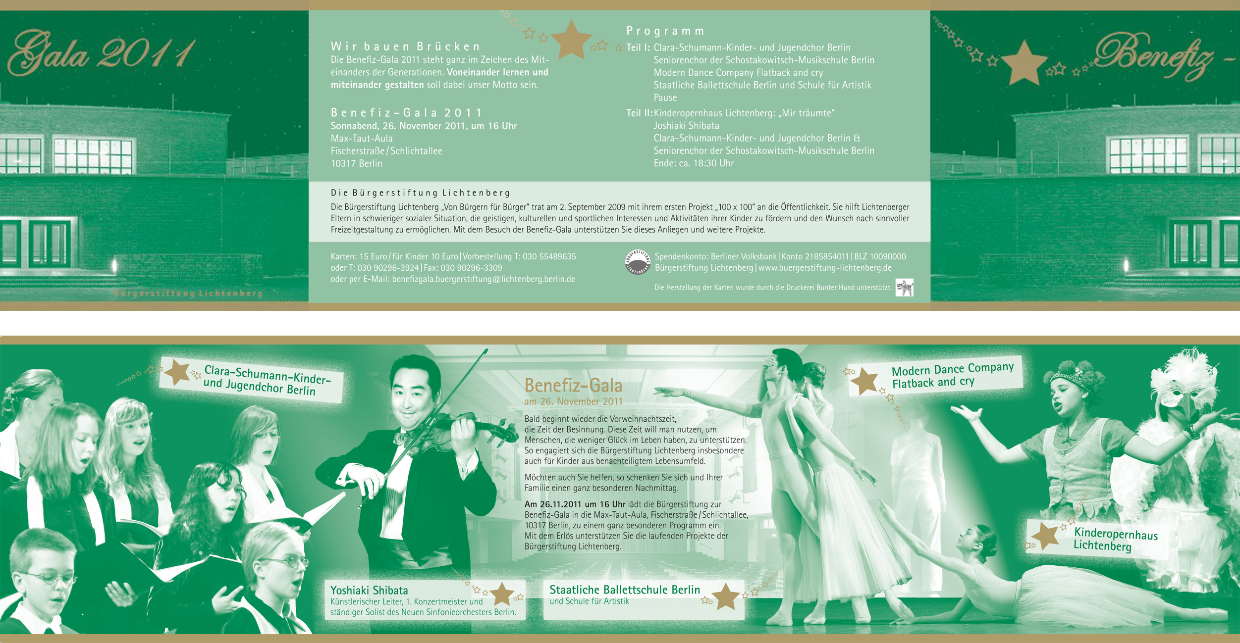 Zu den Mitwirkenden gehören der Clara-Schumann-Kinderchor der Schostakowitsch-Musikschule Berlin, der Seniorenchor der Schostakowitsch-Musikschule Berlin, die Modern Dance Company “Flatback and cry“ sowie das im Jahr 2010 mit großem Erfolg aufgetretene Kinderopernhaus Lichtenberg mit seinem neuen Programm “Mir träumte!”. Ein besonderer Höhepunkt wird der Auftritt des japanischen Violinvirtuosen Herrn Yoshiaki Shibata sein, der die Zuhörer und Zuschauer mit seiner hohen Professionalität begeistern wird. Die Veranstaltung findet am Sonnabend, 26.11.2011 um 16.00 Uhr statt. Ort: Max-Taut-Aula, Fischerstraße/Schlichtallee, 10317 Berlin. Der Eintritt beträgt 15.-€ für Erwachsene, Kinder bis 12 Jahren zahlen 10.-€. Es kann die Möglichkeit der Kartenvorbestellung unter der Tel.-Nr. 030 55489635, der Fax-Nummer 902963309 oder der E-Mail-Adresse benefizgala.buergerstiftung@lichtenberg.berlin.de genutzt werden. Die Karten und die Spendenquittungen werden auf dem Postwege zugesandt. |