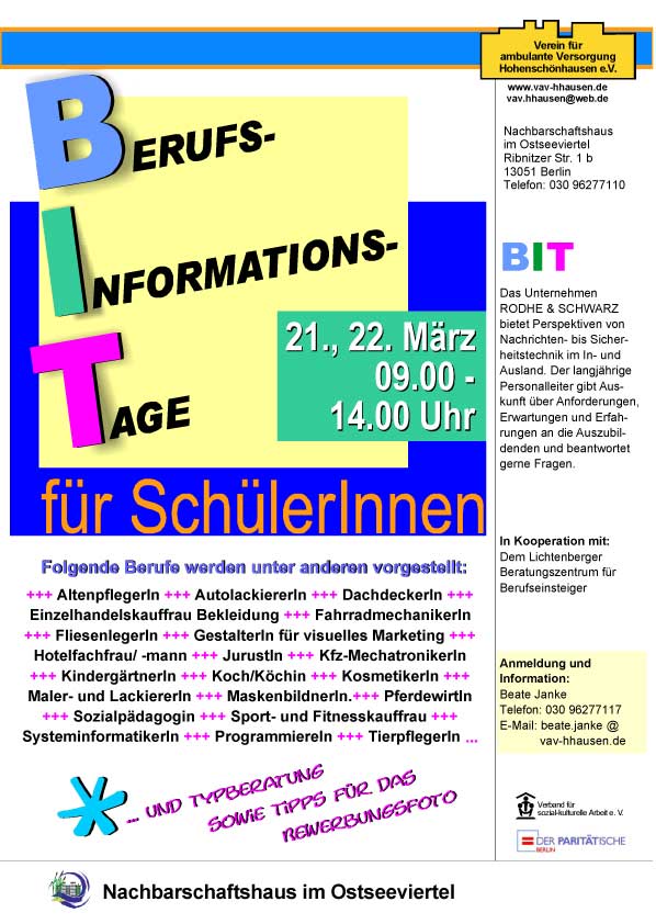 Am 21. und 22. März 2012 in der Zeit von 9:00 bis 14:00 Uhr finden im Nachbarschaftshaus im Ostseeviertel, in der Ribnitzer Str. 1b, Berufsinformationstage (BIT) statt. Die Schüler erhalten an diesen Tagen Gelegenheit, in angenehmer Atmosphäre mit Menschen zusammenzutreffen, die über ihren Beruf und ihre Berufstätigkeit Auskunft geben.