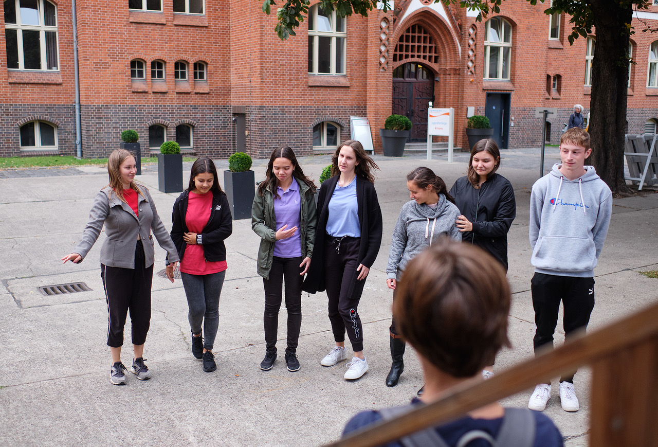 Schülerinnen und Schüler vom Wahlpflichtkurs Darstellendes Spiel der 11. Klasse des Johann-Gottfried-Herder-Gymnasiums Friedrichshain gingen – basierend auf dem Umgestaltungsprozess von einer ehemaligen Turnhalle in eine Theaterspielstätte – der Frage nach, welchen Transformationen ein Denkmal im Wandel der Zeit unterliegt.