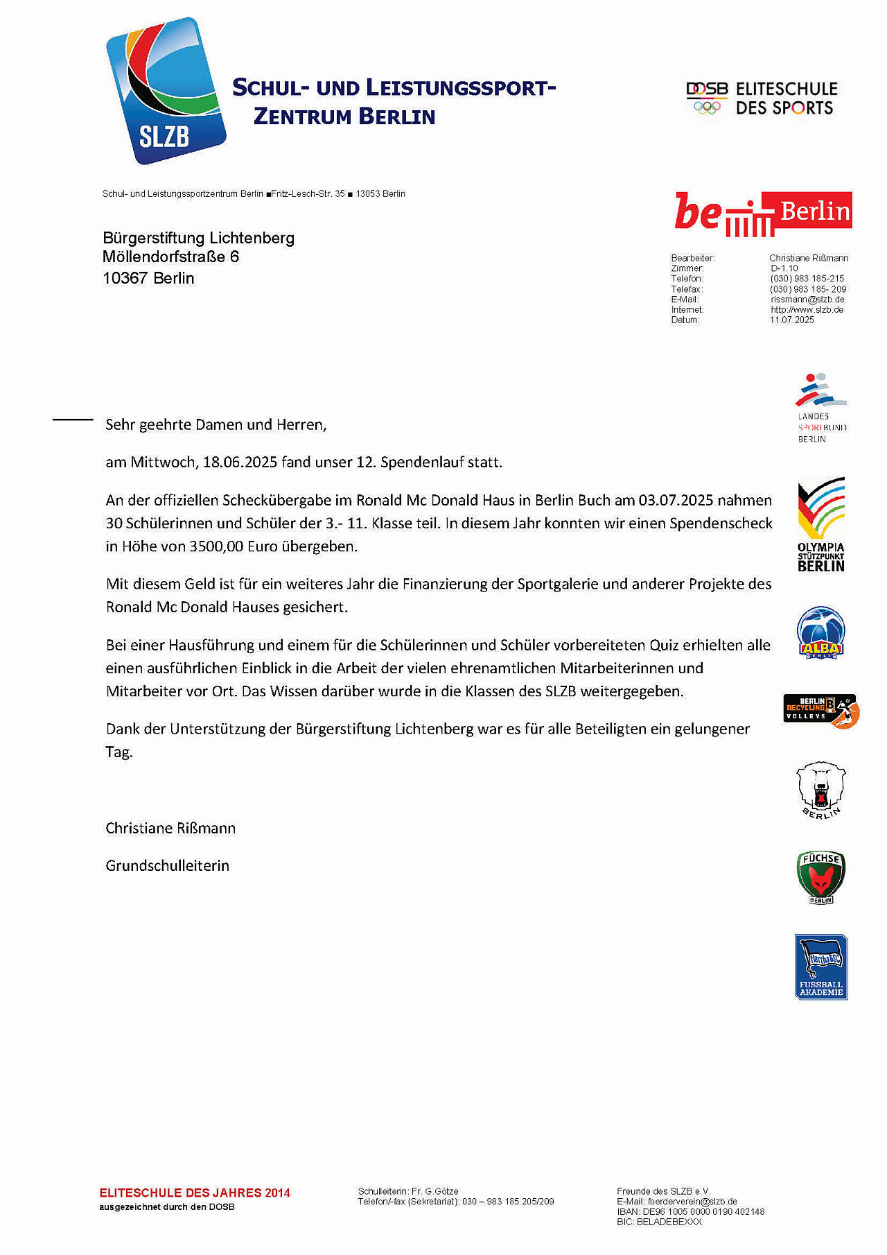 Scheckübergabe an Schul- und Leistungssportzentrum Berlin