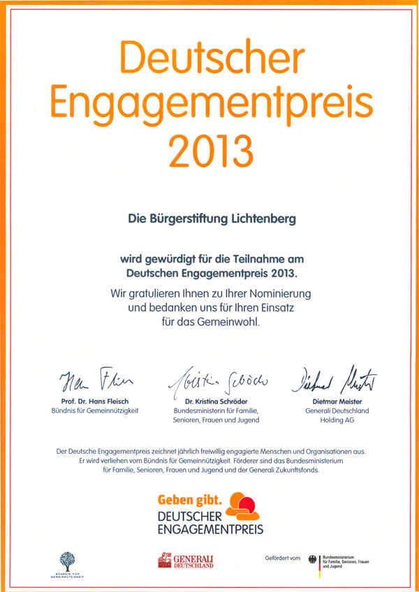 engagementpreis 2013Die Bürgerstiftung Lichtenberg wurde für ihre Teilnahme am Deutschen Engagementpreis 2013 mit einer Urkunde gewürdigt. Der Deutsche Engagementpreis zeichnet jährlich freiwillig engagierte Menschen und Organisationen aus.